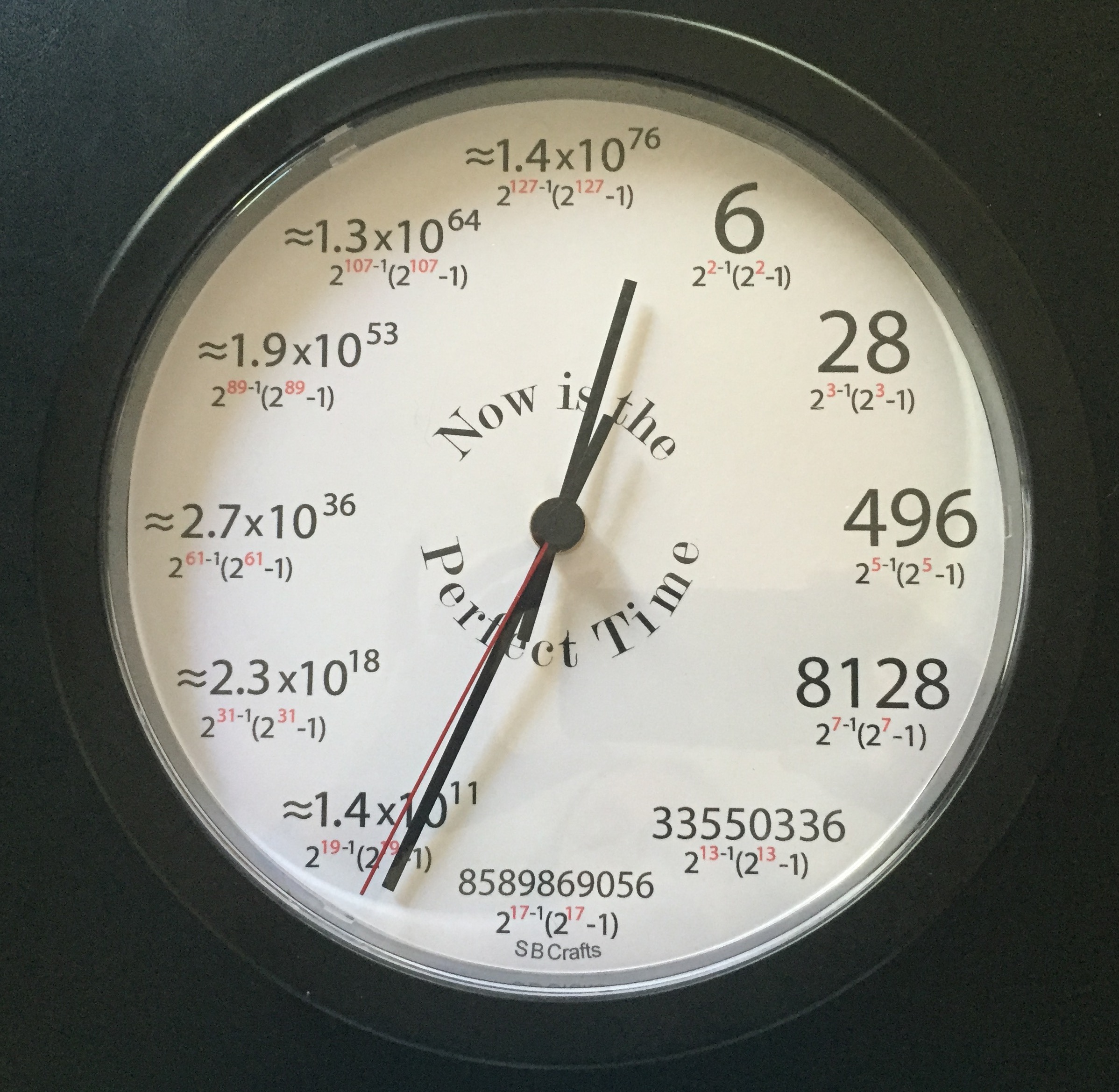 is ≈ 45 million digits long, was discovered in January 2016, the month this clock was created. It shows the first 12 perfect numbers, in terms of the corresponding Mersenne primes, whose index is in red. No one knows how many perfect numbers there are.
