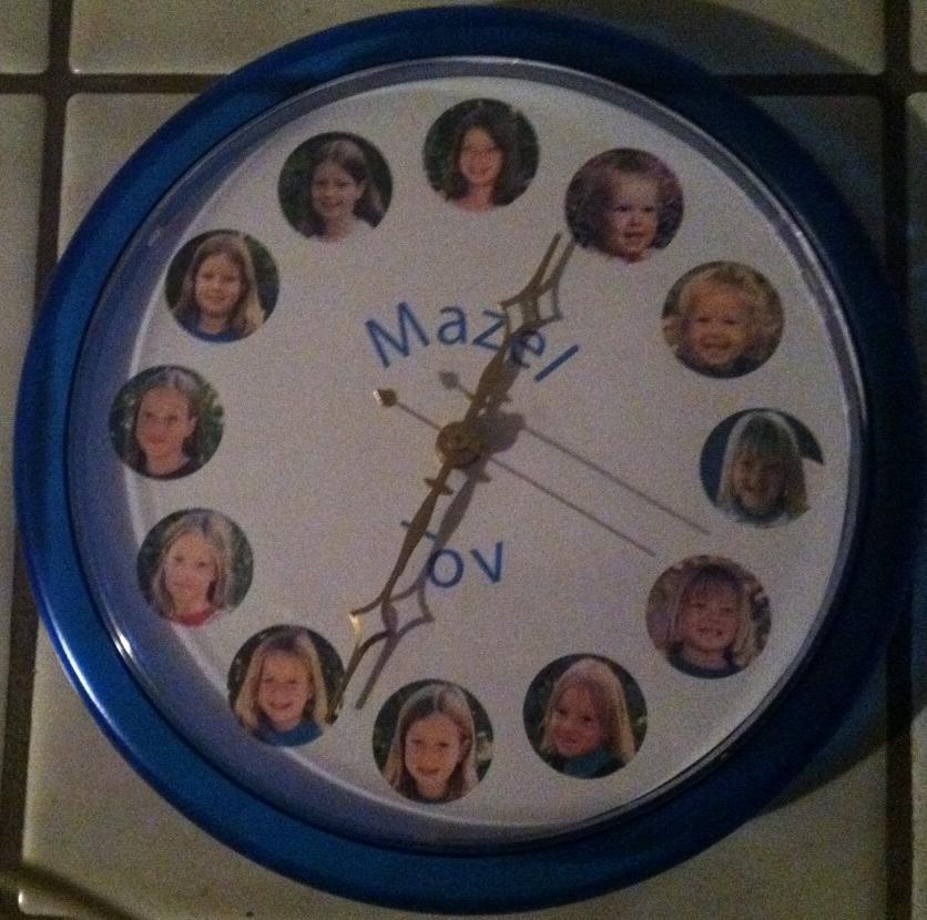 Our most personalized clock is appropriate as a Bat Mitzvah gift with portraits from the ages 1-12, or a first birthday gift with monthly photos, or a high school graduation gift with portraits from the grades 1-12, or a Mother's Day gift for a woman with 12 grandchildren, or . . . The gold-hued hands feature diamonds and a heart, connoting preciousness and love. Both the wording and the rim color are somewhat customizable.