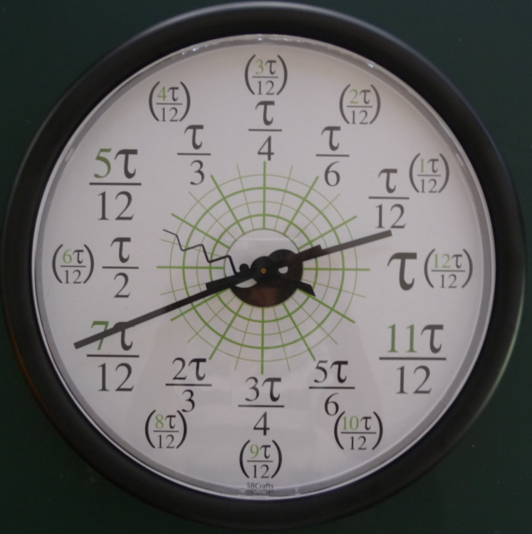 is τ radians, so each hour is τ /12 radians. The central image includes a Tao symbol. Designed on Tau