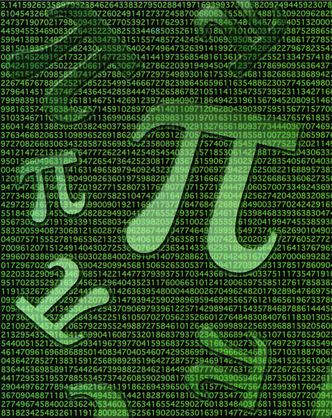 Large π characters attractively superimposed on a background of the decimal expansion of π to many, many places (over 6000 – we lost count!). This paper coordinates particularly nicely with our Pi Math Clock and our Radian Math Clock, as well as our Binary Pi T-shirt, but actually complements any of our Math Clocks – except for the Tau Version. | Advanced math and physics equations scrawled on a background of graph paper. This design coordinates especially well with our Professional, Engineers and Student Math Clocks and our Chemistry Clock. | Phosphorescent green bits on a black background, which say, appropriately, "wrapping paper" in ASCII code. Binary numbers appear on our Professional, Engineers and Student Math Clocks, so it would be very fitting to wrap any of them in this paper. And it coordinates absolutely perfectly with both our Binary Clock and our Binary Pi T-shirt. | |||