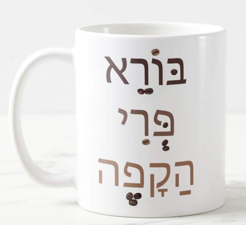 The font is in three shades of brown, ranging from the color of black coffee to the color of coffee with lots of cream. The dots that are vowel and dagesh marks are pictures of real coffee beans. (If you're giving the mug as a gift, we suggest filling it with coffee beans.)